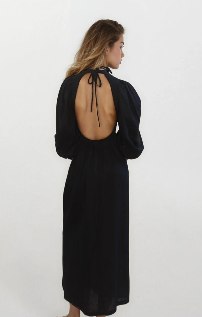 - Open back detail with neck ties