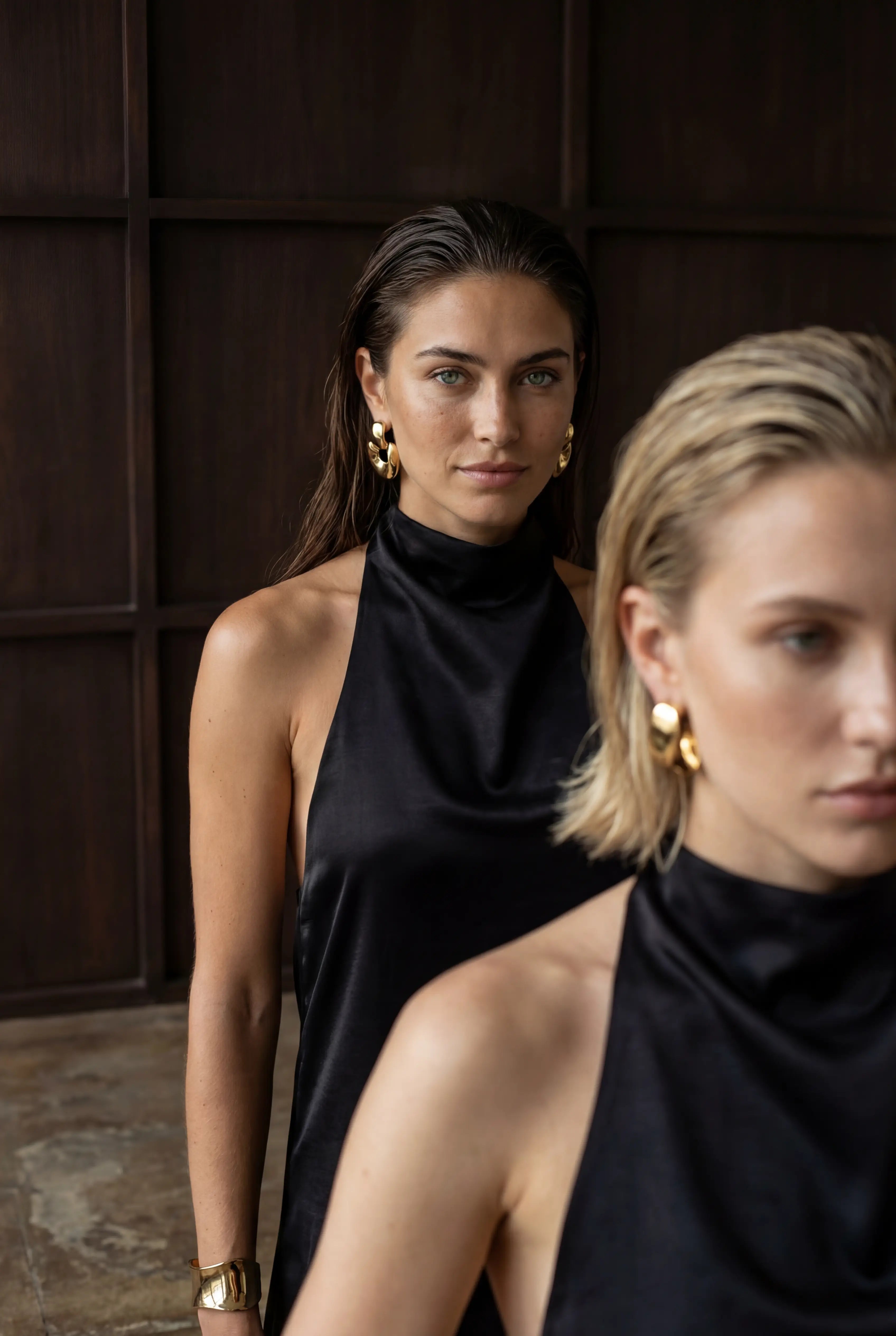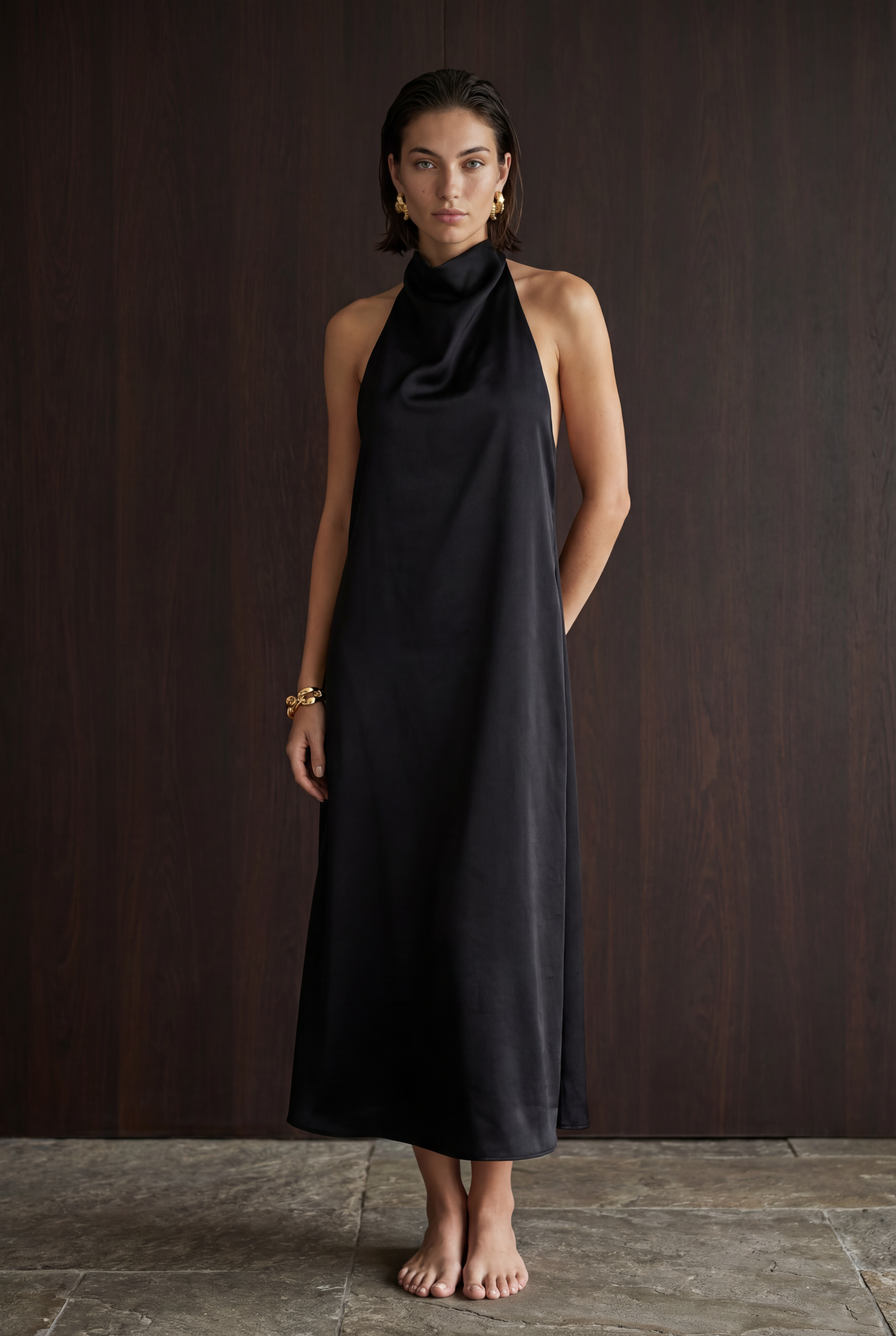 - Draped halter neckline for a sculptural, sophisticated look