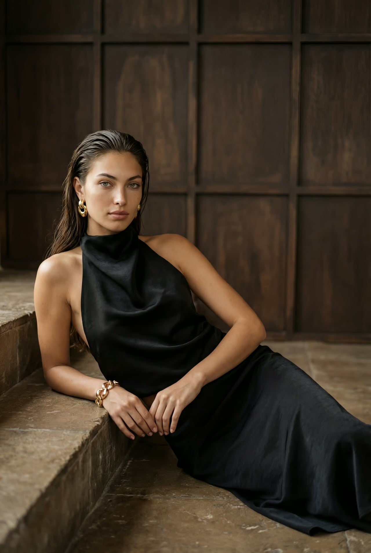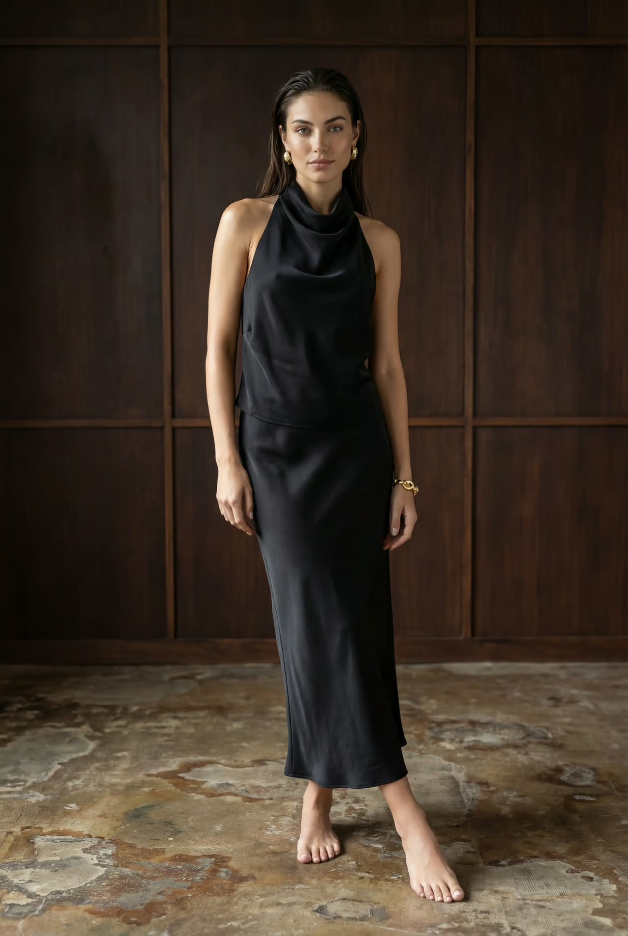- High neck halter neckline with a subtle drape for a sculptural, sophisticated look